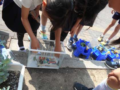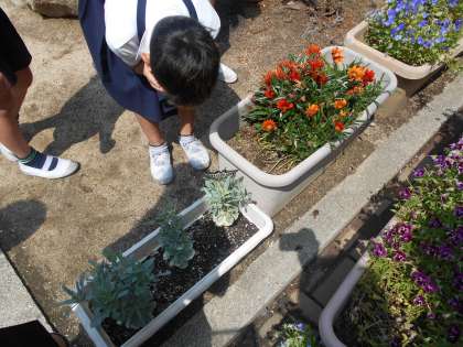 アゲハやモンシロチョウを卵から育て、成虫になるまで観察しています。見事に成虫になったら、正門の前で子どもたちと一緒に旅立ちを見送っています。上手に飛び立てたら、「バイバーイ!」「元気でね!」と大きな歓声があがりました!