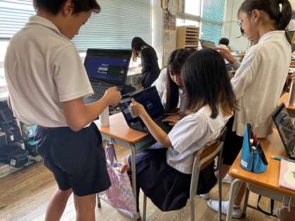 理科のテストが終わった児童は学習者用端末でカフートをして、友だちとクイズで競い合っていました。