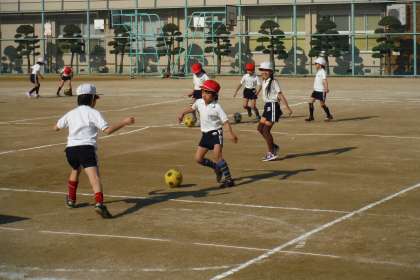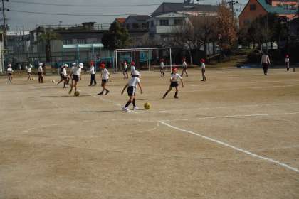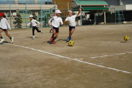 コートの奥に設置された箱をゴールに見立てて、ドリブルをしながら相手をかわしてゴールを狙ってボールを蹴りこみました。ドリブルの上手な子、ゴールに向かって強いボールを蹴れる子など、Jリーガー顔負けのプレーがたくさん見られました。
