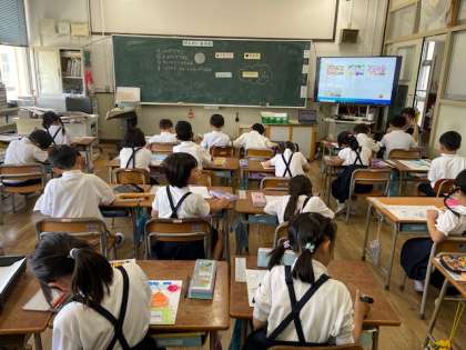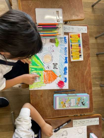「せんせいあのね」という題材でクレパスでしっかり色を塗り込んで描いていきました。