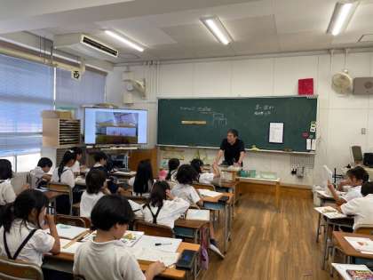長さの学習をしています。算数の教科書の横の長さを竹のものさしを使って測ってみました。