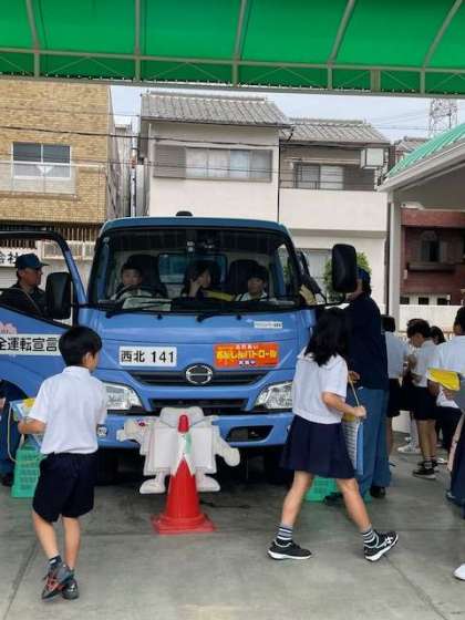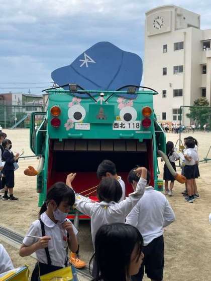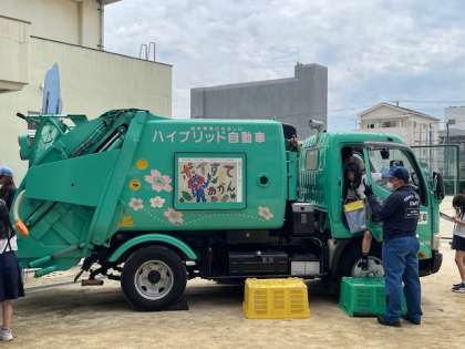 ごみを収集してくれるパッカー車が学校に来てくれました。4年生は全員パッカー車に乗せてもらい、クイズを考えました。