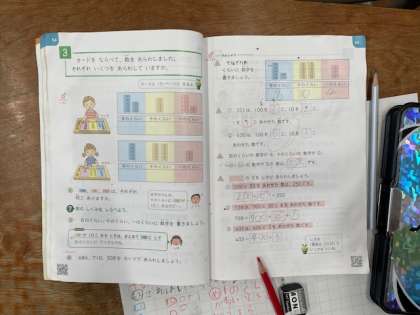 「100より大きい数をしらべよう」の学習をしました。教科書の下にあるQRコードを1人1台端末で読み込み、練習問題に取り組みました。