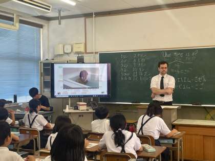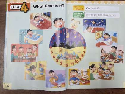 What time is it?の使い方を学習しました。映像を見ながら、教科書の絵に当てはまるものを選んでいきました。