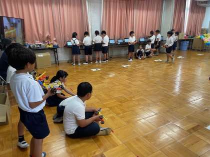 「風やゴムのはたらき」の学習で、作った車を巻いたゴムの力で走らせました。
