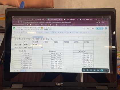 何回巻いたら、どれくらいの距離を走るか、パソコンに記録しました。