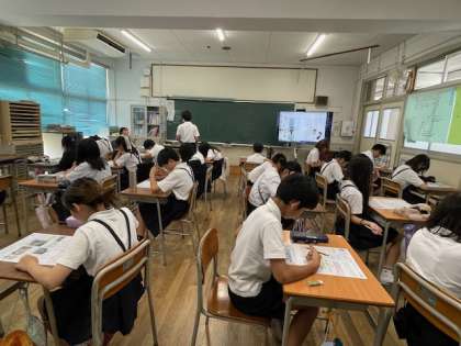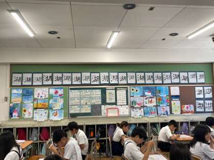 教室の後ろの掲示板は夏の絵手紙や習字が飾られています。