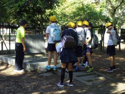 修学旅行4 公開日 2013/10/23 更新日 2013/10/23 お知らせ 平和記念公園の見学です。ここでも、ボランティアさんの案内で見学しました。 解説を聞きながら、平和学習を深めていきました。