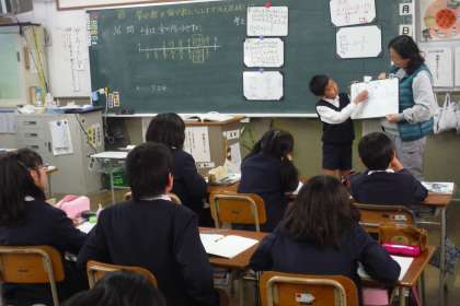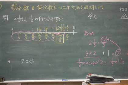 帯分数を仮分数になおす方法を説明する学習をしました。発表ボードを使って、自分の意見をしっかり発表していました。
