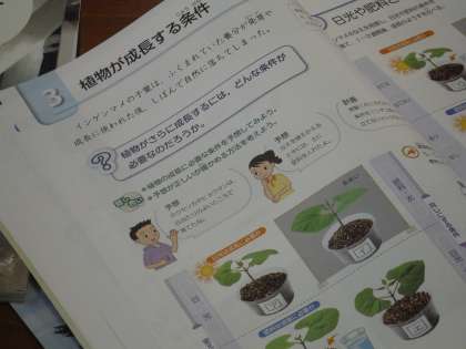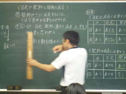 「日光や肥料と植物の成長」の実験の結果を考察しました。