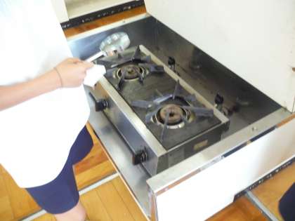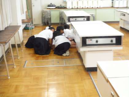 身の回りのごみを見つけるため、虫眼鏡を持って家庭科室の汚れを見つけに行きました。