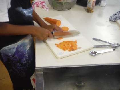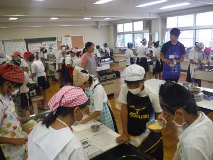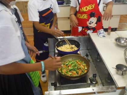 野菜炒めとスクランブルエッグを作りました。自分たちで作った料理のお味は、「とても美味しかった」とのことでした。