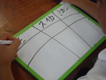 9個の野菜や果物など、先生が考えるものと縦か横の列が合致すれば、先生の宝箱からシールがもらえるというゲームをしました。