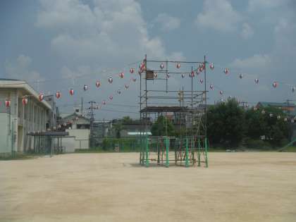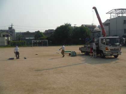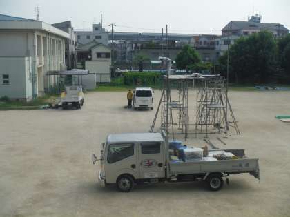 明日8月6日(土)、本校運動場にて地域盆踊りが行われます。そのご準備に、早朝より地域の方が見守るなか、業者さんの手によって徐々に櫓が建てられていきました。