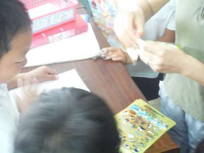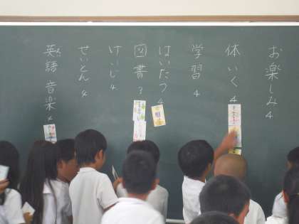 明日の連絡を確認して、担任から連絡帳に子どもたち待望のシールを貼ってもらいました。その後、2学期の学級の係をきめました。