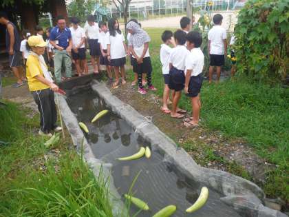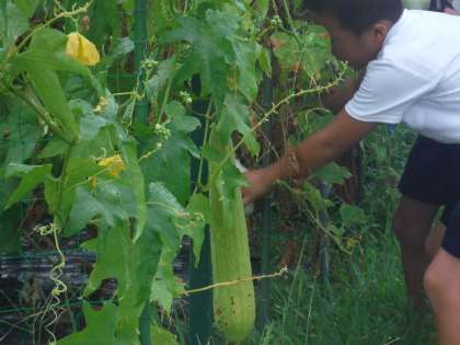 ひどい雨でへちまを採ることができないかなと思っていましたが、雨が上がりなんとか一人一個ずつ切り取ることができました。子どもたちは、大きくなったへちまやひょうたんに驚きながら、はさみを入れていました。愛育会の方と管理作業員さんにお手伝いいただきました。ありがとうございました。