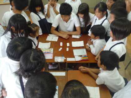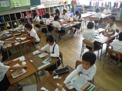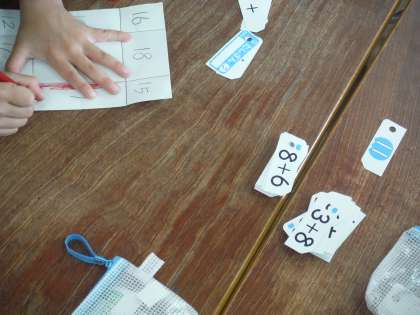 たし算カードを使って、相手がめくったカードのたし算答えを言います。答えが正解ならその答えの数字の場所の色をぬることができます。間違わずに相手より早く全部の色がぬれた方が勝つというゲーム形式で行うたし算の学習です。
