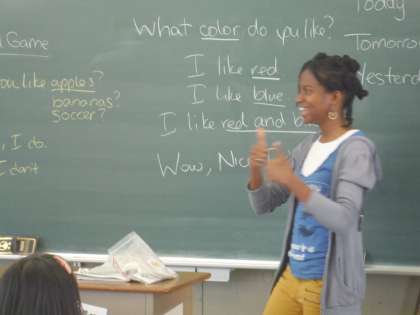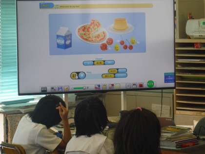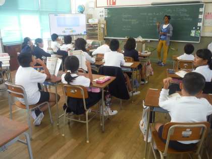 「What( )do you like?」動物、色、食べ物などを入れて発音の練習しました。