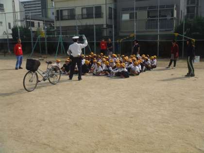 西淀川警察署の方が来てくださり、自転車の正しい乗り方の説明をしてくださいました。その後、実際に自転車に乗ってコースを走ってみました。