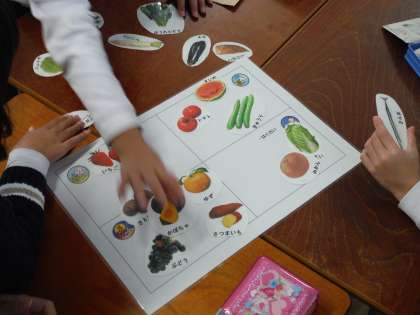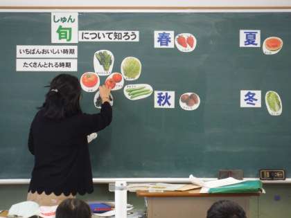 栄養教諭の方が来てくださり、「旬」の食物について学習しました。それぞれの食材を四季に分けました。なんと全問正解の班があったようです。
