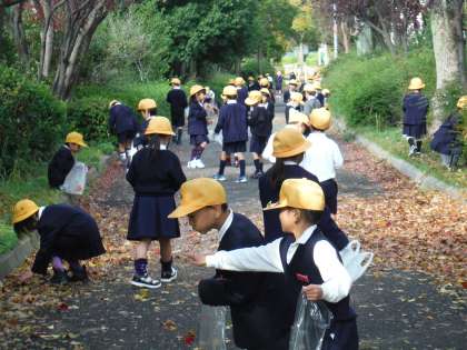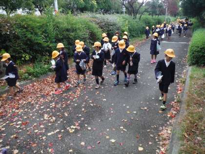 西淀川高校横の通りに行き、どんぐりや落ち葉を拾いました。その最中、「見て、見て、こんなにたくさん拾えたよ」「この葉っぱ、きれい?」と話しかけてくれました。愛育会の皆さんが、行き帰り及び現地での安全に努めてくださいました。ありがとうございました。