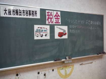 梅田市税事務所の職員の方がお越しくださいまして、6年生に税金についてご講話いただきました。税が暮らしの中でどのように生かされているかなど、DVDのアニメーションや具体的な例を指示しながらご説明いただきました。