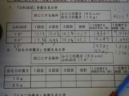 振り子が一往復する時間をふり幅を変えて測定し、その結果から