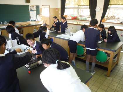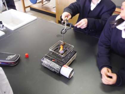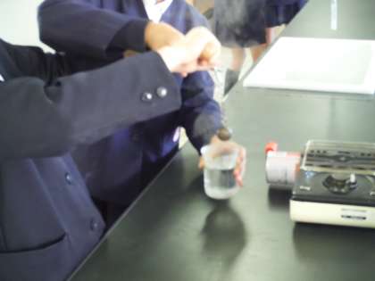 「金属も温度によって体積が変化するか」を鉄球を熱したあと、リングを通ることができるかの実験を行いました。子どもたちは、熱したあと鉄球が通らなかったこと、さらには鉄球を冷やしたら通るようになったことを実際に見て、とても興味深げな表情をしていました。