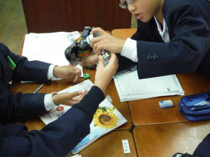 離れた導線の間に、何を挟んだら明かりが点くかを実験しました。挟んだものは、アルミ缶、木片等です。