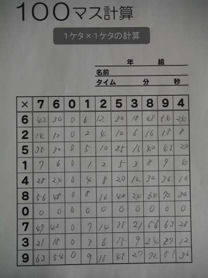 百マス計算にチャレンジ!一番にできた子は、驚きの1分20秒でした。