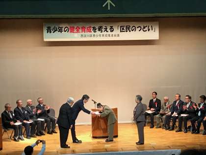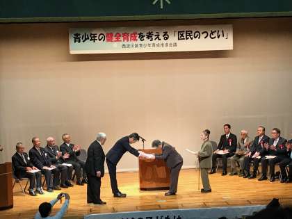 昨日、エルモ西淀川で、青少年の健全育成を考える区民のつどいが開催されました。第1部で、普段のみまもり活動に対する表彰式が行われました。川北地域からも代表してお二人の方に表彰状が授与されました。