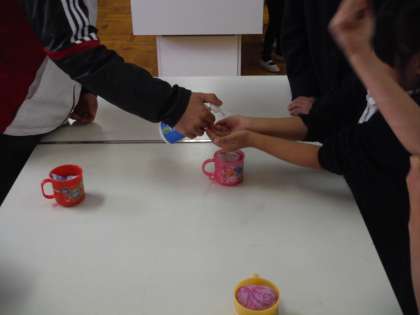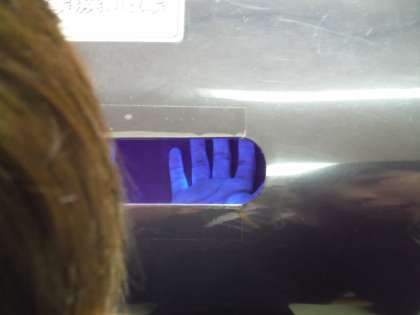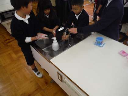 昼休み、保健委員会の子どもたちが、1年生に手洗いとうがいの方法を教えました。1年生の子どもたちが、手洗いをした後、汚れが落ちているかを確認すると、落ちていないところが意外と多いことに驚いていました。