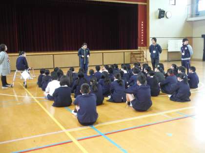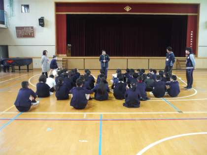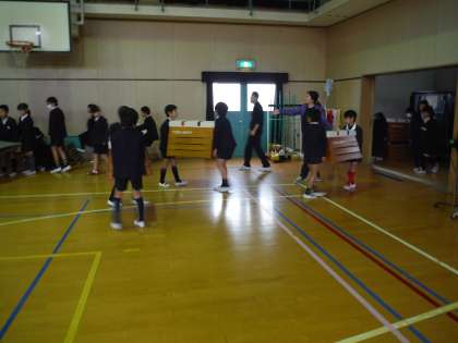 児童集会の後、6年生は卒業式に向けての練習が始まるのを前に、学年主任の先生よりお話がありました。5年生は、式場準備の前段階として講堂のフロアーにある体育道具を片づけてくれました。