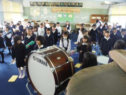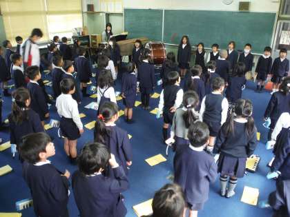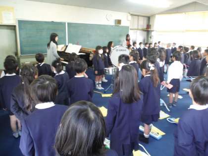 入学式で新入生歓迎のための発表に向けて、学年練習に取り組みました。子どもたちは、元気な声で学校の楽しさを伝えたり、歌や演奏を通して歓迎の意を表そうと一生懸命練習に励んでいます。