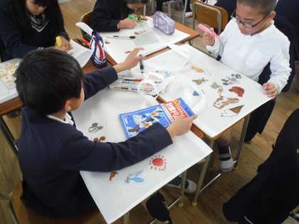 3学期に制作した作品を持ち帰る袋に好きな絵を描きました。