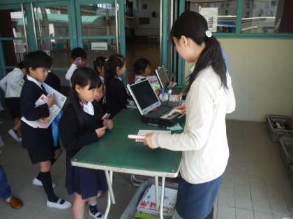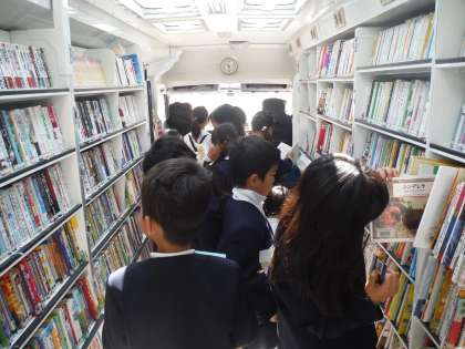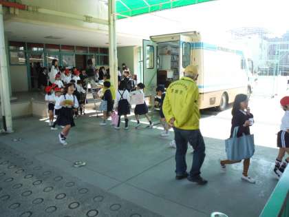 今年度初めての自動車文庫がやってきました。たくさんの子どもたちが、本を借りに来ました。いつも愛育会の方が、見守りをしてくださっています。