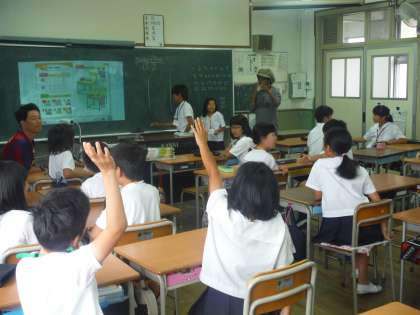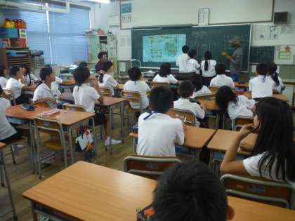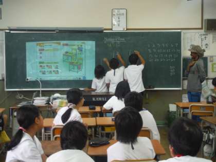 C-NETの先生が発音した数字を、誰がいち早く黒板に書けるかを競いました。