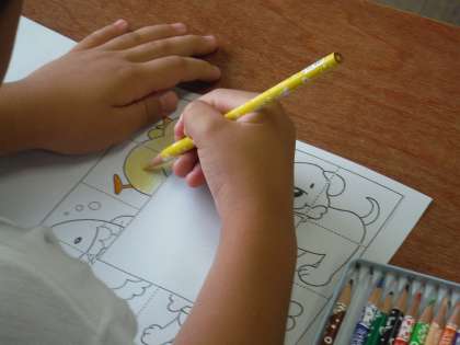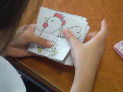 色を塗って、なかを切り抜き折っていくと、犬やニワトリになりました。