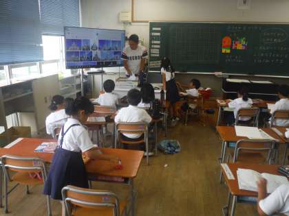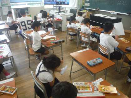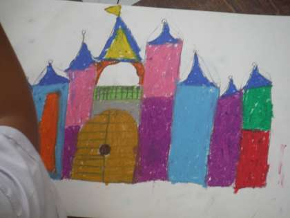 鉛筆で下書きし、クレパスで色を塗り、最後にはさみで切って建物を作りました。