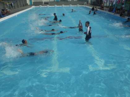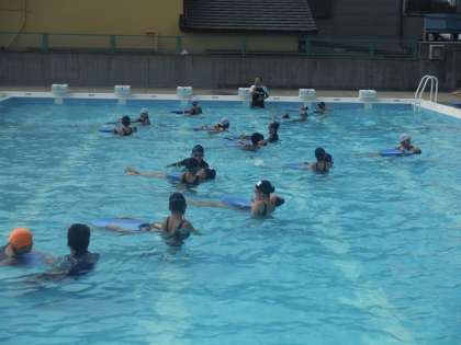 今学期最後のプール水泳です。ビート板やバディとでクロール練習をしました。一生懸命練習した後は、自由に楽しみました。