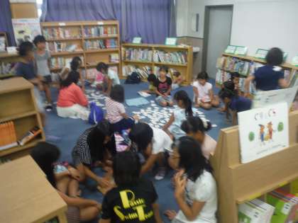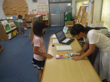 夏季休業中、子どもたちが少しでも本に触れる機会がもてるように、図書室を開放しました。受け付けは、図書委員の子がしています。