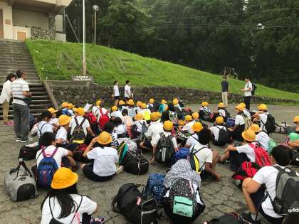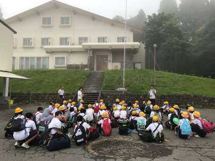 11時にハチ高原に到着し、開舎式を行いました。子どもたちは、霧にビックリでした。