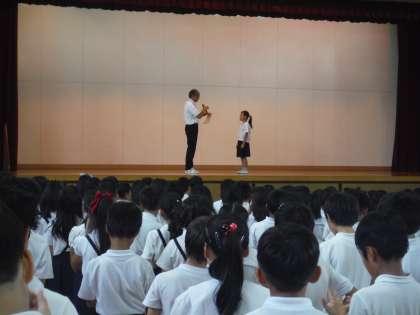 今年から夏季休業が一週間短くなり、今日から二学期が始まりました。長期の休み明けだったにもかかわらず、とても落ち着いた様子で始業式を進めることができました。始業式では、表彰状伝達や講師の先生の紹介をしました。学校にようやく子どもたちの元気な姿が戻り、学校が生き返ったように思います。子どもたちのより良い成長を目指して、保護者・地域の皆様のご理解とご支援を賜りますよう、どうぞよろしくお願いします。