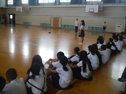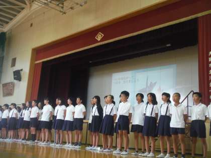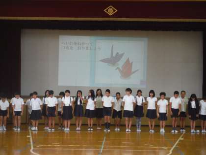 9月7日、土曜授業の1時間目に行う平和集会時に、原爆が投下された広島に修学旅行に行く学年として、平和を考えるメッセージを全校に向けて発信する意練習を行いました。