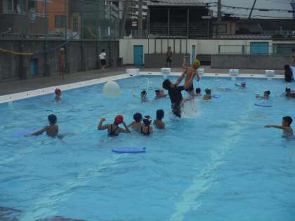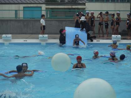 今日は、今年度、最後のプール水泳となりました。先生方が、簡易ウォータースライダーをつくり、子どもたちは楽しそうにマイスタイルで滑っていました。