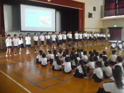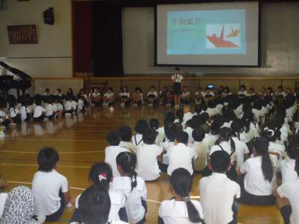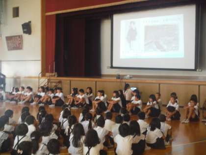 土曜授業にて、平和集会を行いました。これまでの平和集会の形式から少し変更し、保護者の皆さんにも見ていただこうと、土曜授業での活動としました。6年生の「平和に向けたメッセージ」と「翼をください」の合唱などを中心に、各学年からも平和へのメッセージとして歌を歌いました。
