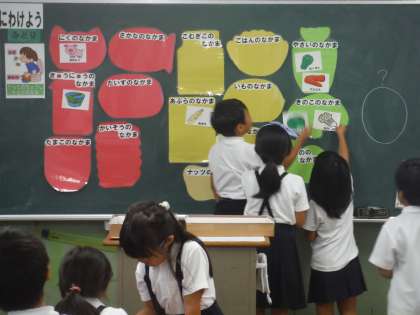 栄養教諭による栄養授業が行われました。「食べる物3つに分けよう」の学習をしました。昨年学習したこともよく覚えていました。
