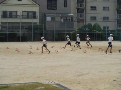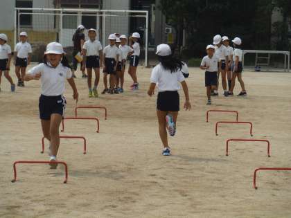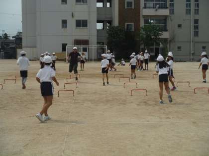 ハードル走の前段階として、等間隔に並ぶ低いバーを飛び越えながら走る練習をしました。