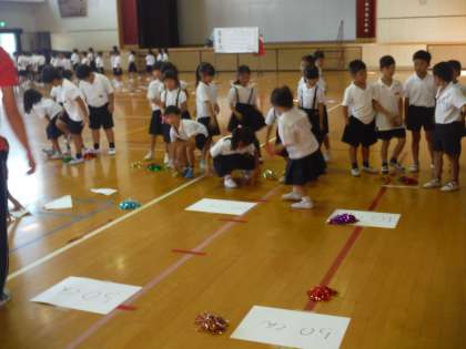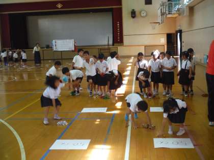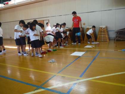 (その2)足の甲の載せたものをどこまで飛ばせるかという遊びでした。