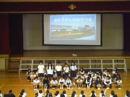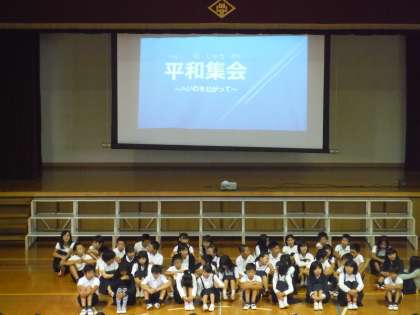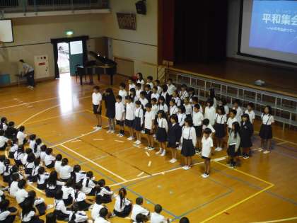 先日、6年生が広島方面に修学旅行に行きました。その中で、広島平和公園での碑めぐり、平和宣言、平和記念資料館の見学等の活動を通して、本校であらためて平和への祈りを込めて、広島での取組みを全校児童に発表しました。